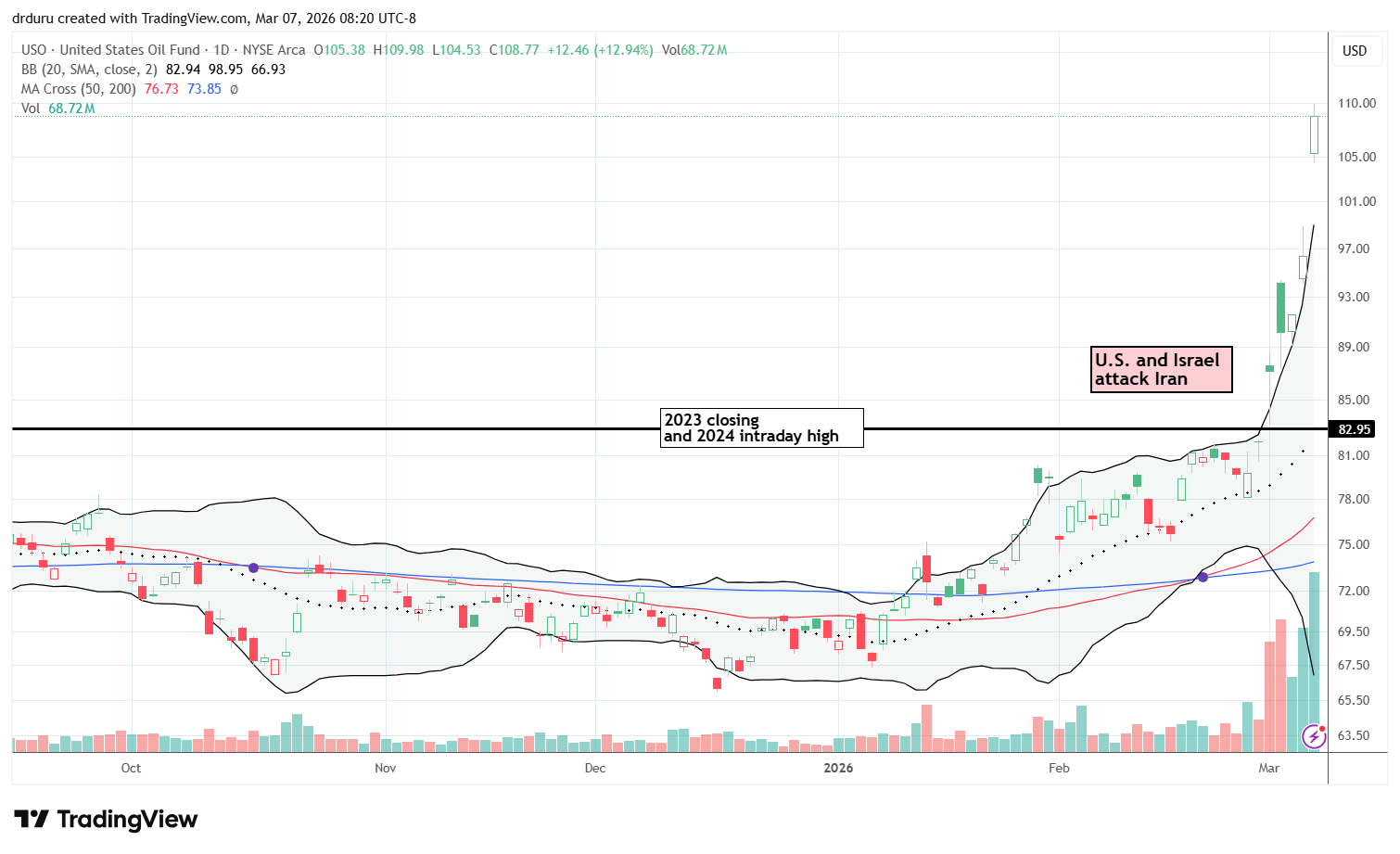 Technical status: The United States Oil Fund (USO) soared 32.7% for the week to a 7-year high as the U.S. and Israel’s war against Iran continued.