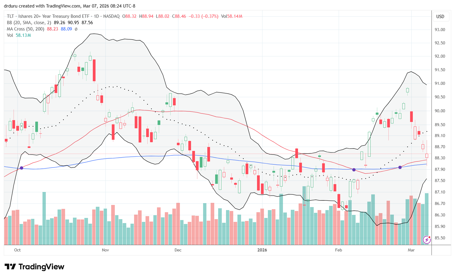 Trade commentary: U.S. Treasury bonds have failed to play the typical safe haven role. TLT even fell after the poor jobs report. Instead of being a safety trade, the sell-off in bonds reflects a different set of market fears: the increasing inflationary threat from an increasingly expensive war. Moreover, global confidence in the U.S. looks like it is rapidly eroding. Still, I bought TLT on Friday both for yield and for a potential bounce off support.