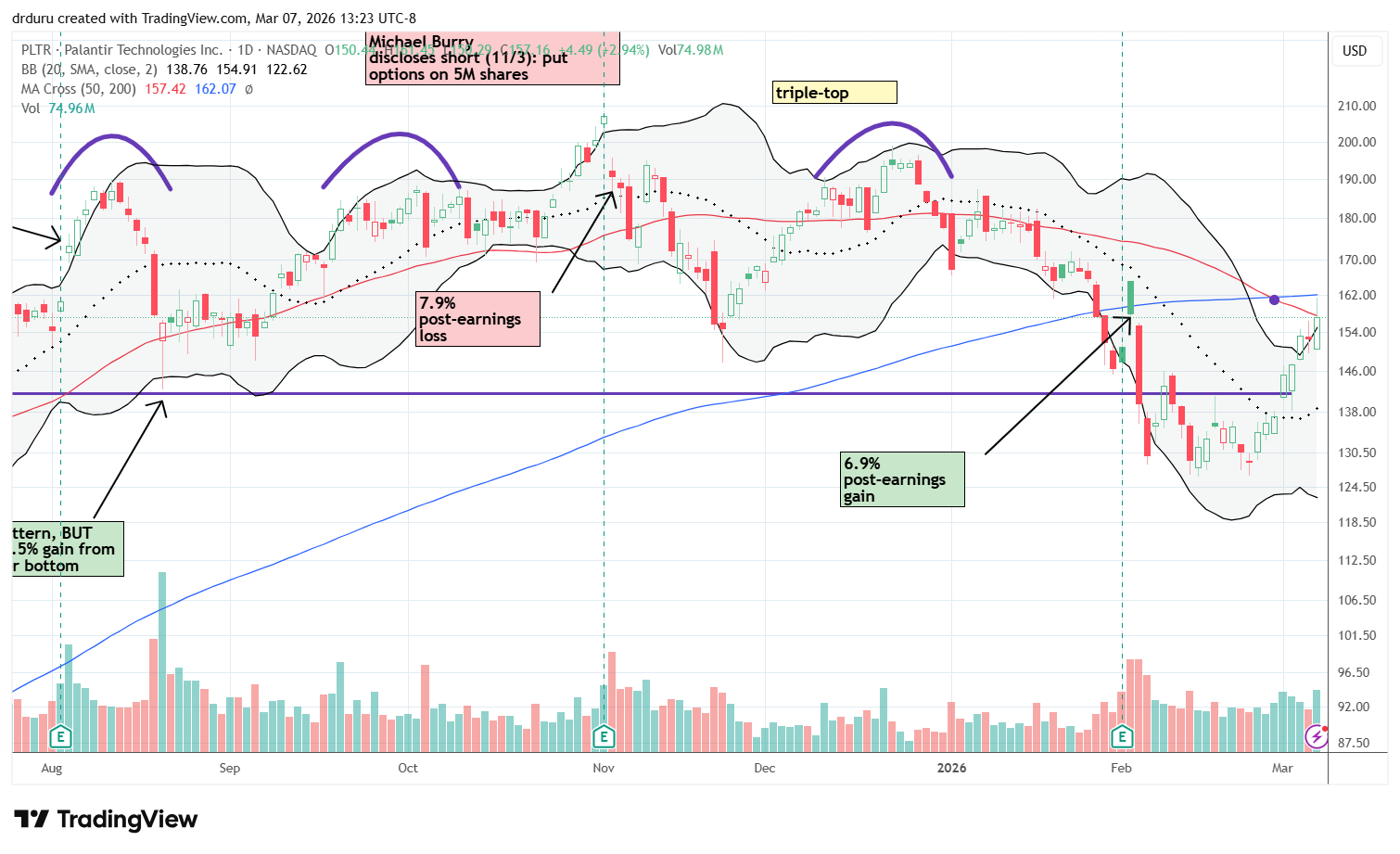 Technical status: Palantir Technologies, Inc (PLTR) rallied from a 9-month low for a breakout above the critical $142.34 level. I bought the breakout and took profits at 50DMA resistance.